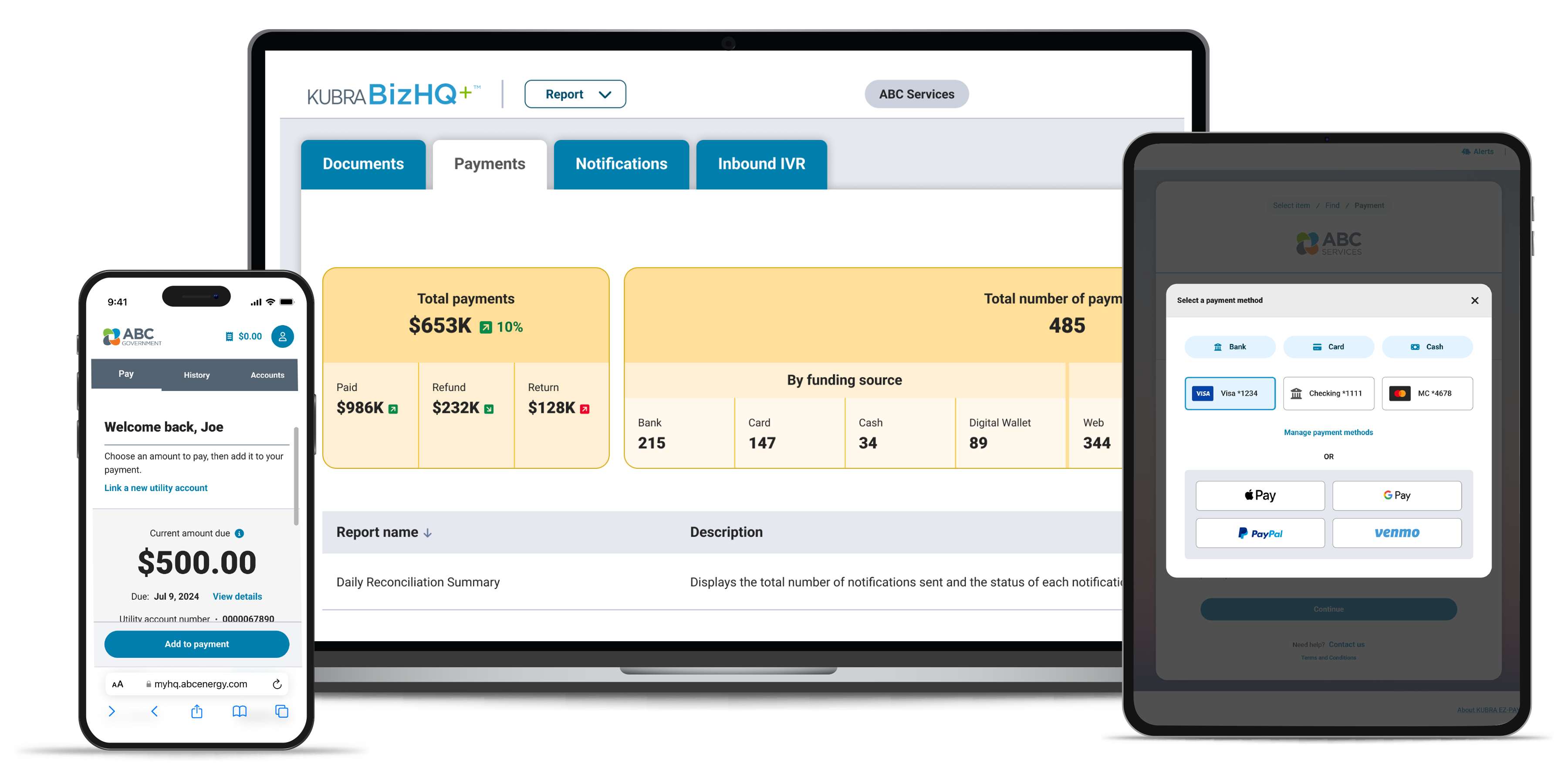 KUBRA HQ is designed to elevate every interaction, enhancing both the enrolled and non-enrolled customer experience with KUBRA MyHQ+™ and KUBRA EZ-PAY+™, while empowering billers with real-time visibility, control, and insights through KUBRA BizHQ+™.